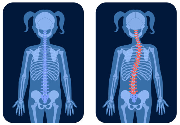 La scoliose se manifeste par une déviation de la colonne vertébrale, parfois visible lorsque l’enfant se penche vers l’avant.