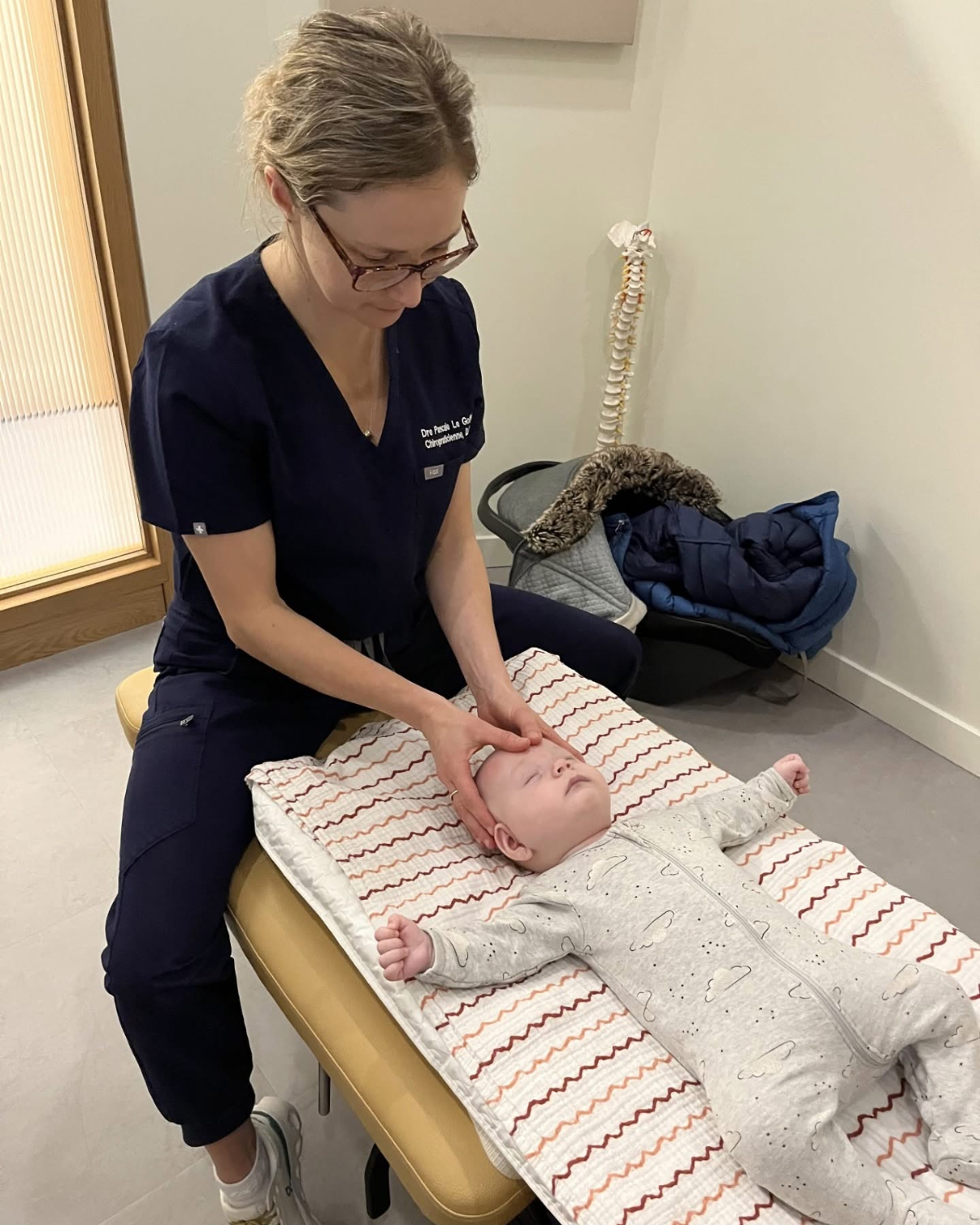 Un examen clinique du nourrisson est ensuite effectué. Celui-ci comprend l’observation de la posture, l’évaluation des mouvements, la palpation des muscles et des articulations du cou et du reste du corps, ainsi que l’analyse de la forme du crâne et de la symétrie du visage. Le chiropraticien procède également à un examen neurologique adapté, incluant l’évaluation des réflexes primitifs et certains tests orthopédiques.